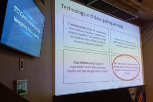 Kokybės vertinimo departamento direktorius Aidas Aldakauskas ir vyriausioji specialistė Ingrida Rabačiauskaitė kartu su kolegomis iš Europos nagrinėja etišką ir saugų dirbtinio intelekto taikymą, atitinkantį Bendrąjį duomenų apsaugos reglamentą (BDAR) bei ES DI aktą, diskutuoja, kaip sukurti saugią ir gerai valdomą aplinką, kurioje dirbtinio intelekto įrankiai, tokie kaip RAG modeliai ar individualizuoti GPT, papildytų profesionalų patirtį, bet jos nepakeistų. Praktinės sesijos mokslo centre „Techniquest“ leis išbandyti įrankius, kurie ateityje padės efektyviau analizuoti įrodymais grįstus švietimo duomenis.